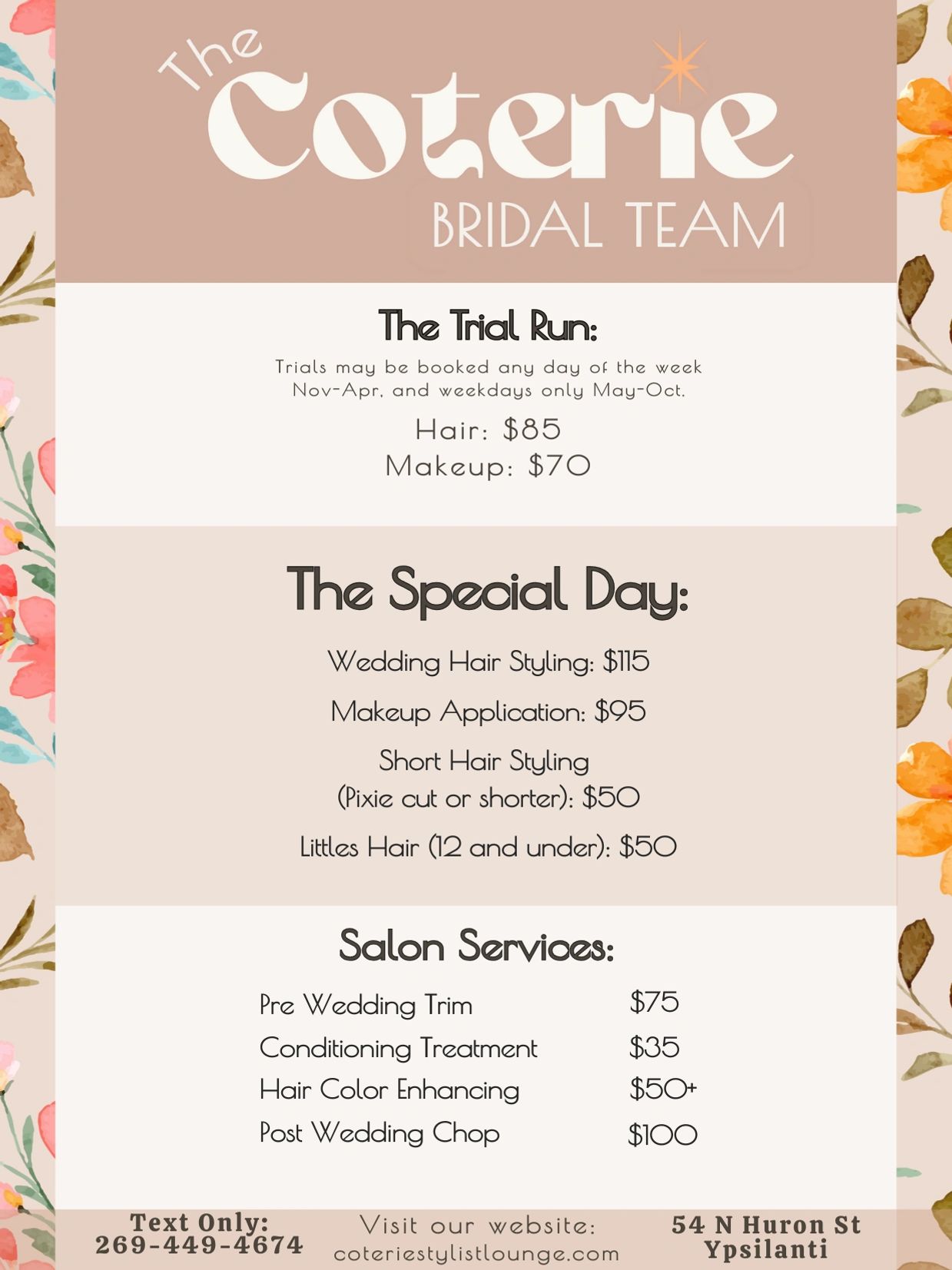 The Coterie Stylist Lounge in downtown Ypsilanti is the perfect spot for small wedding parties to relax, sip, and get glammed up for the big day. Located at 54 N. Huron Street, our mid-century modern space brings warmth, charm, and just the right amount of vintage flair to your wedding hair and makeup morning.